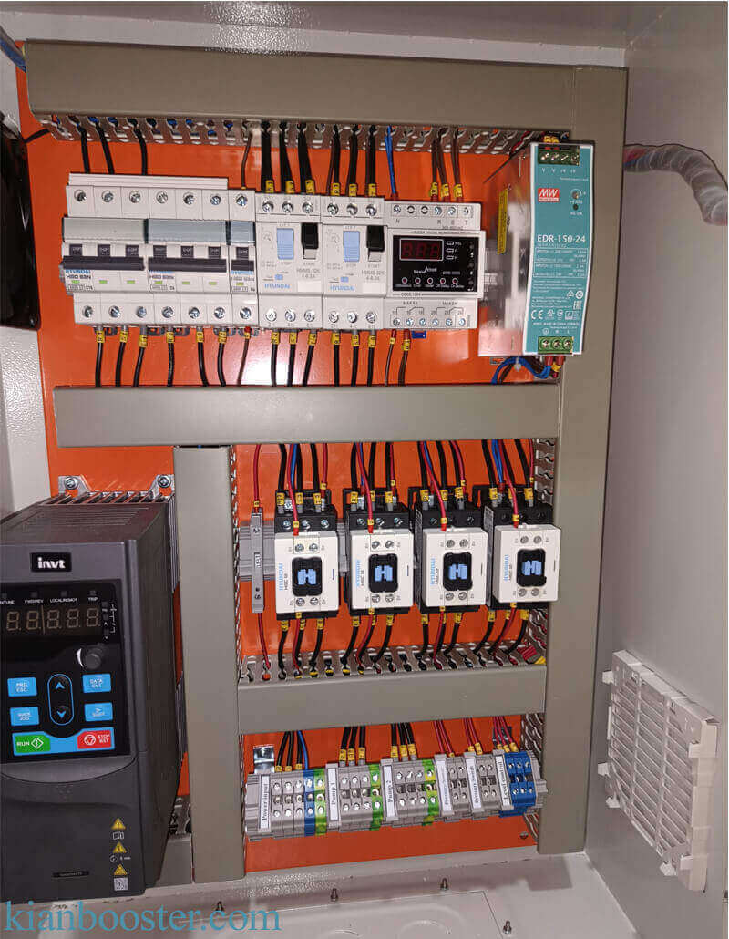 برای کنترل فشار آب مصرفی به تابلو برق دورمتغیر( دور و راهاندازی متغیر ) یا دورثابت ( فرکانس و دور راهاندازی ثابت ) نیاز است. برای راهاندازی بوسترپمپهای دورمتغیر سهفاز تک ( تک پمپ ) تا چند خط (چند پمپ ) با استفاده از کنترلر مخصوص بوستر پمپ آبرسانی میکنیم. برای هرکدام از بوستر پمپهای تک خط و چند خط را توسط بوستر پمپ کنترلرو راهاندازی میکنیم و نحوه وایرینگ هر کدام متفاوت است.